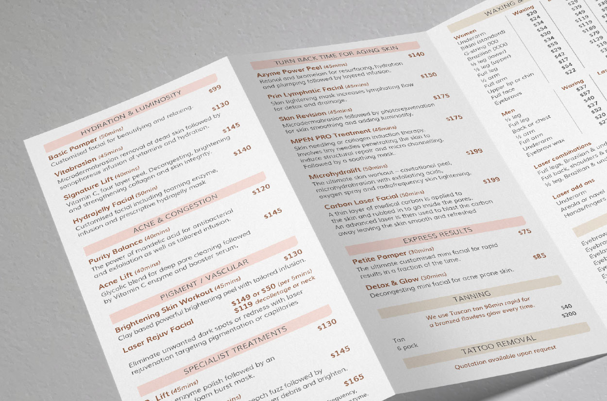 Changing perceptions from a general beauty salon to a specialised ‘skin boutique’. The brand look was developed to have a lux feel and emphasis the high grade skin treatments offered but still have a warm relaxing vibe. A typographic BB butterfly was conceptualised for the brand as a symbol of transformation to beautiful skin. Used as a shimmering icon on both print and digital collateral and on signage frosting creating a cut out ‘window’ into the boutique A deep bronze was chosen for the logotype and BB brand symbol, which sit on a lush background gradient fading from ivory to peach – like the flush of healthy skin after a treatment! Printed items feature a lovely bronze foil on uncoated paper stock further enhancing the luxury feel. A consistent image style, typography and tone of voice was created as part of the brand toolkit to inform marketing campaigns about new treatments.