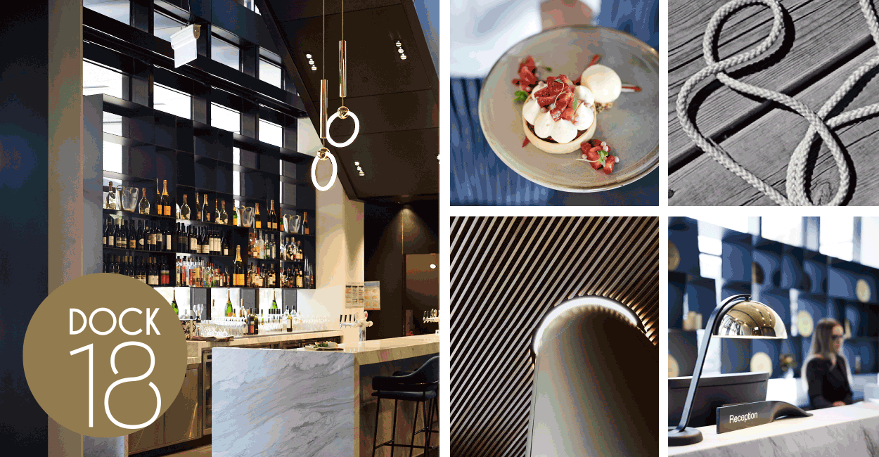 DOCK18 / Taking inspiration from the Docklands setting on the marina and circular interior details, a logo was created with a nautical feel for the restaurant at The Four Points Hotel by Sheraton.