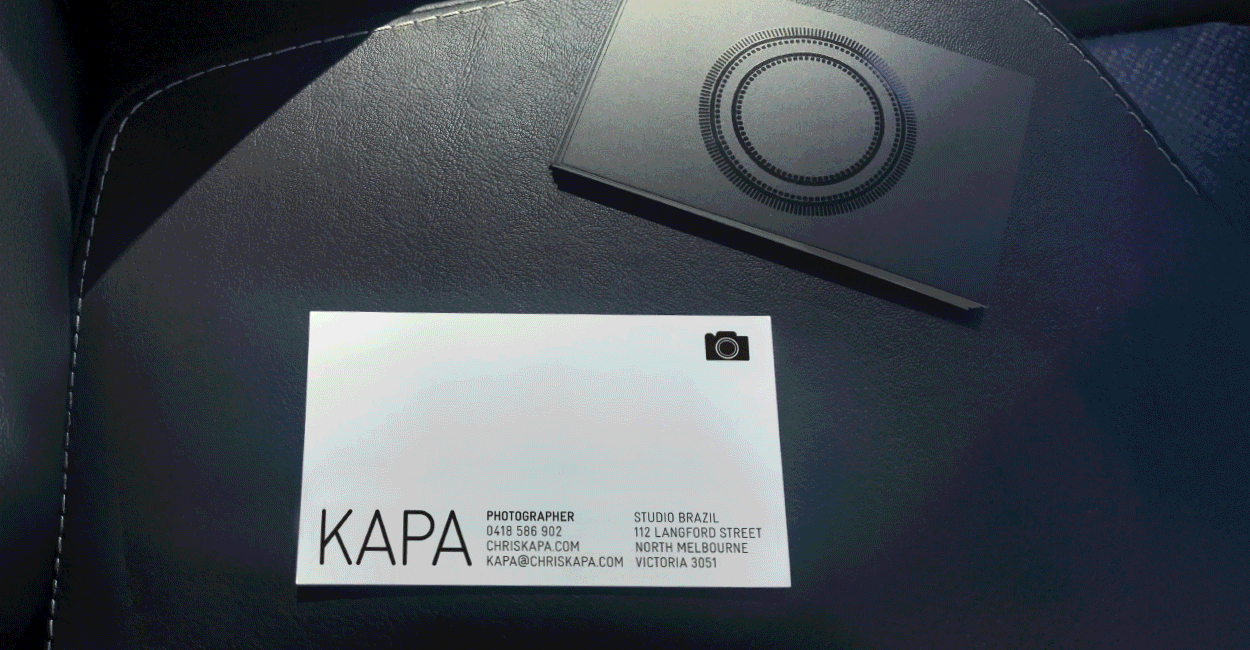 KAPA / Identity, promotion piece series and website for the enigmatic photographer. Gloss varnish was used on printed items for a textural effect on the lens graphics