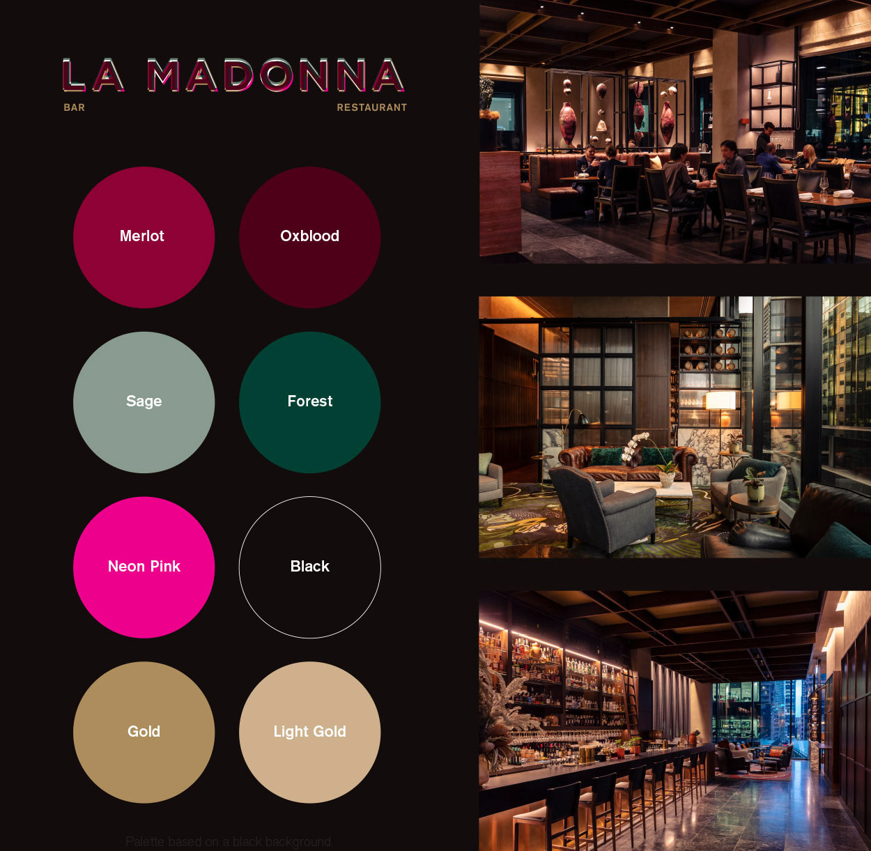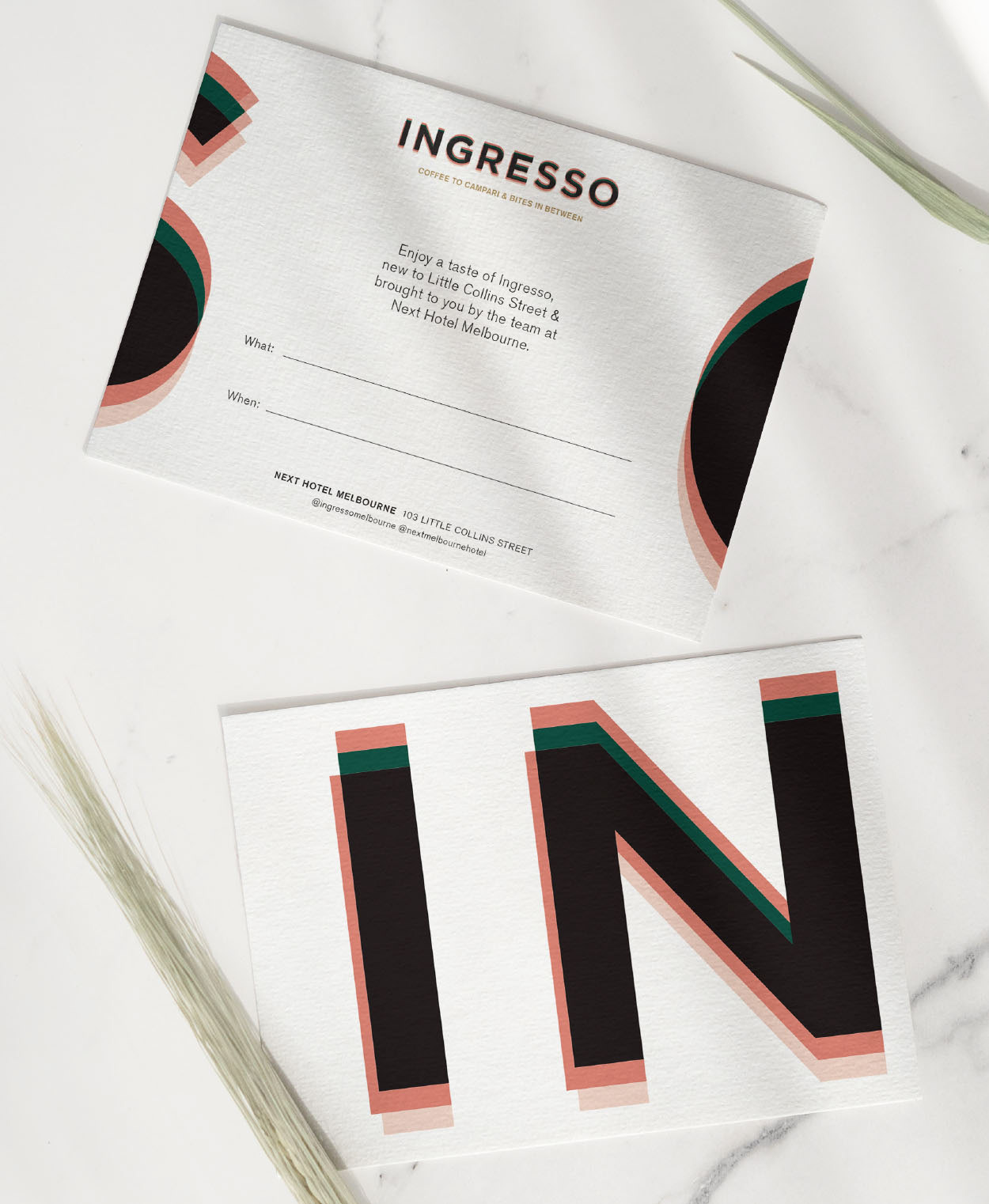 Ingresso is a ground level daytime ‘grab and go’ cafe also offering aperitivo, it's the ‘gateway’ (Italian translation) to the upstairs bar and restaurant level of La Madonna. Coming soon will be a ‘members only’ club based around the barrel room in the restaurant. These spaces weren’t intended just to service the hotel but are an entry to Melbourne’s food scene in their own right. The f&b concepts embody the hotel’s ethos of ‘doing things differently than what’s expected’, a subtlety of design, but demanding a second look. The creative is a direct response to the personalities of the chefs and the experience – reinterpreted classics, slightly unexpected, playful with traditions. The brands are confident and clever, with the family of logotypes designed to look like they are moving pieces of art. They can come together, pull apart, be enlarged for effect and animated. The palettes and layering of textures within the interiors were all taken into consideration.