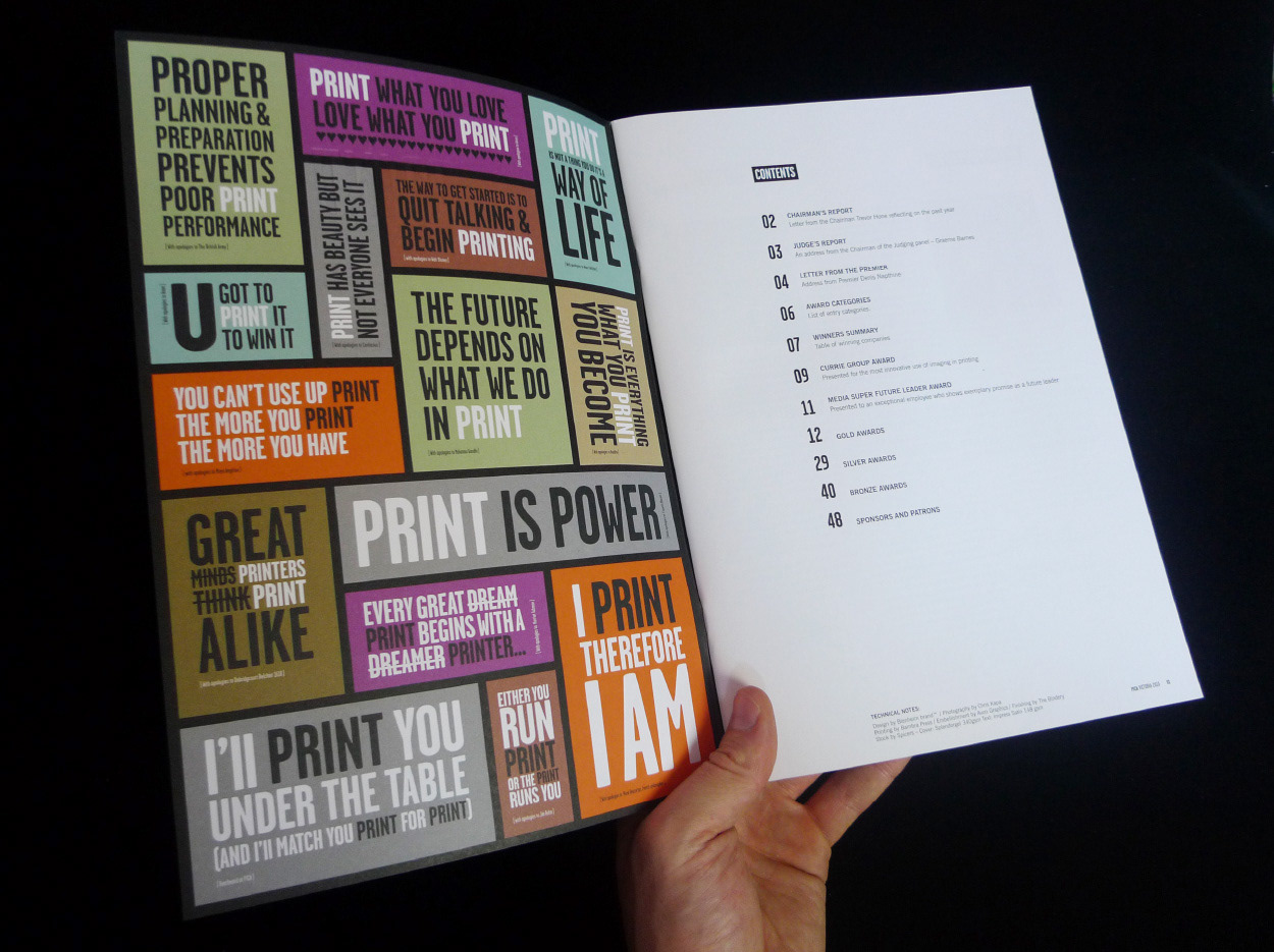 Printing Industries Craftsmanship Awards With the print industry fighting to stay afloat in a digital world, printers needed a call to action. What better way than to celebrate and promote their craft together at the print industry’s night of nights - The PICAs. Famous aspirational quotes were ‘reworded’ to have relevant meanings to print and attributed 'with apologies' to their author. Particular quotes were matched appropriately to the application. Print finishes such as foils & embosses (awards book cover), metallic inks (award book internal) different colour ways (menus) and paper stocks gave the printed applications a special touch. The solution was both fun and inspirational to all! Client: Blenheim Brand / PIAA